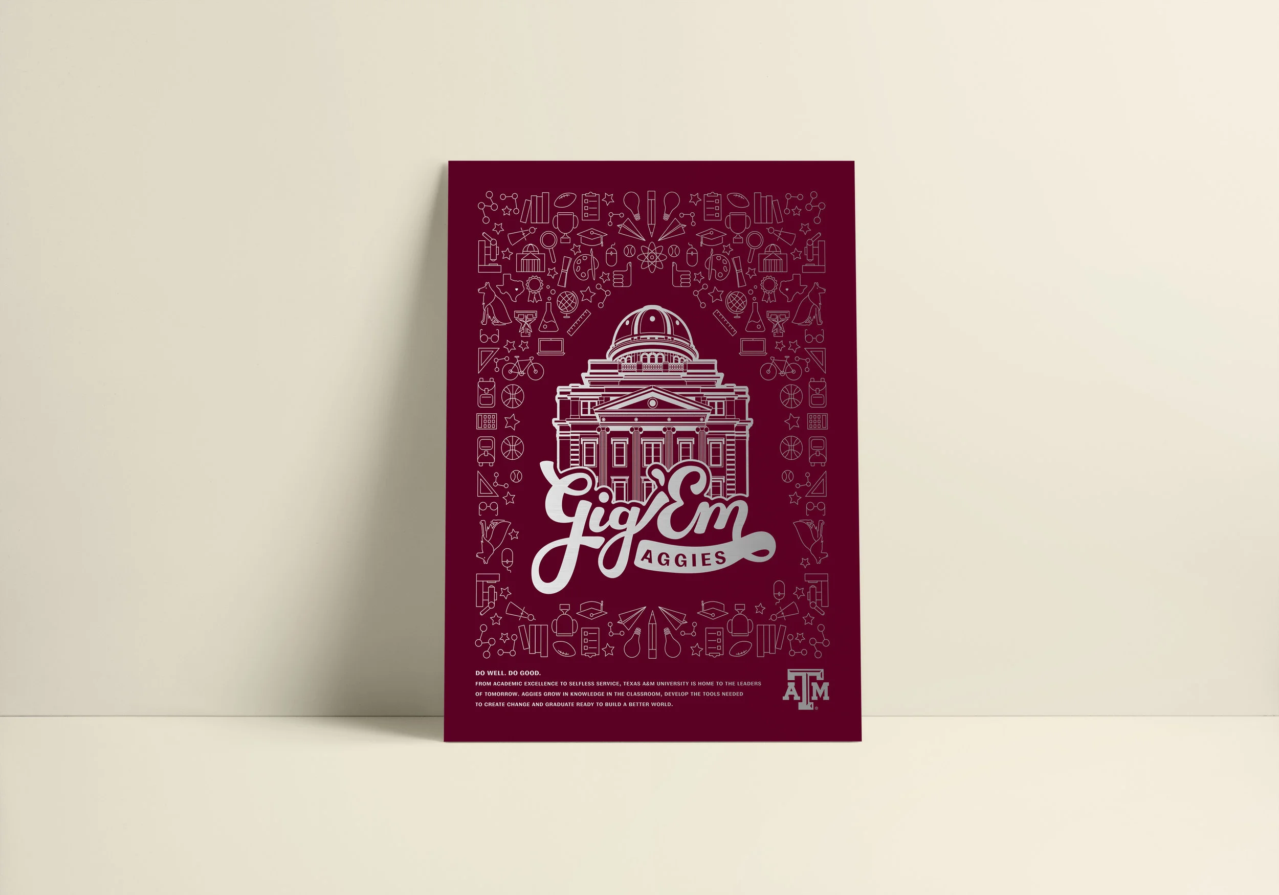 During my time as the Graphic Design Intern for the Marketing team in the Enrollment and Academic Services, I created deliverables to appeal to prospective students. I wanted to ensure that this poster would be timeless and wall-worthy. Each icon represents an aspect of Texas A&M’s values and traditions, with the Academic building as the main subject.