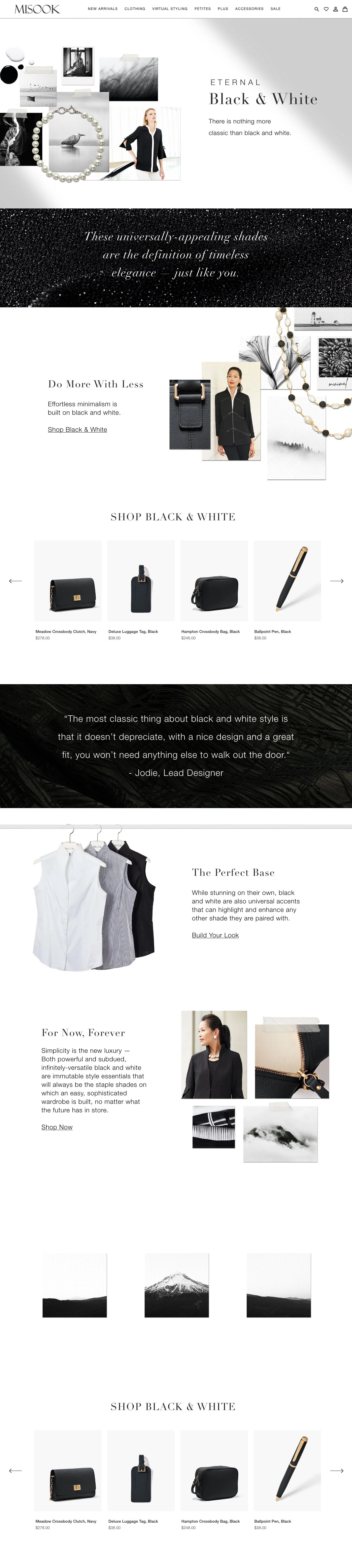 As a graphic designer at Ming Wang, I strategized content, assisted in photoshoots, and created engaging marketing collateral for all three of their brands; Ming Wang, Misook, and Jones New York. This landing page strategically draws in Misook’s customers with a visually appealing story of their elegant black and white wardrobe staples.