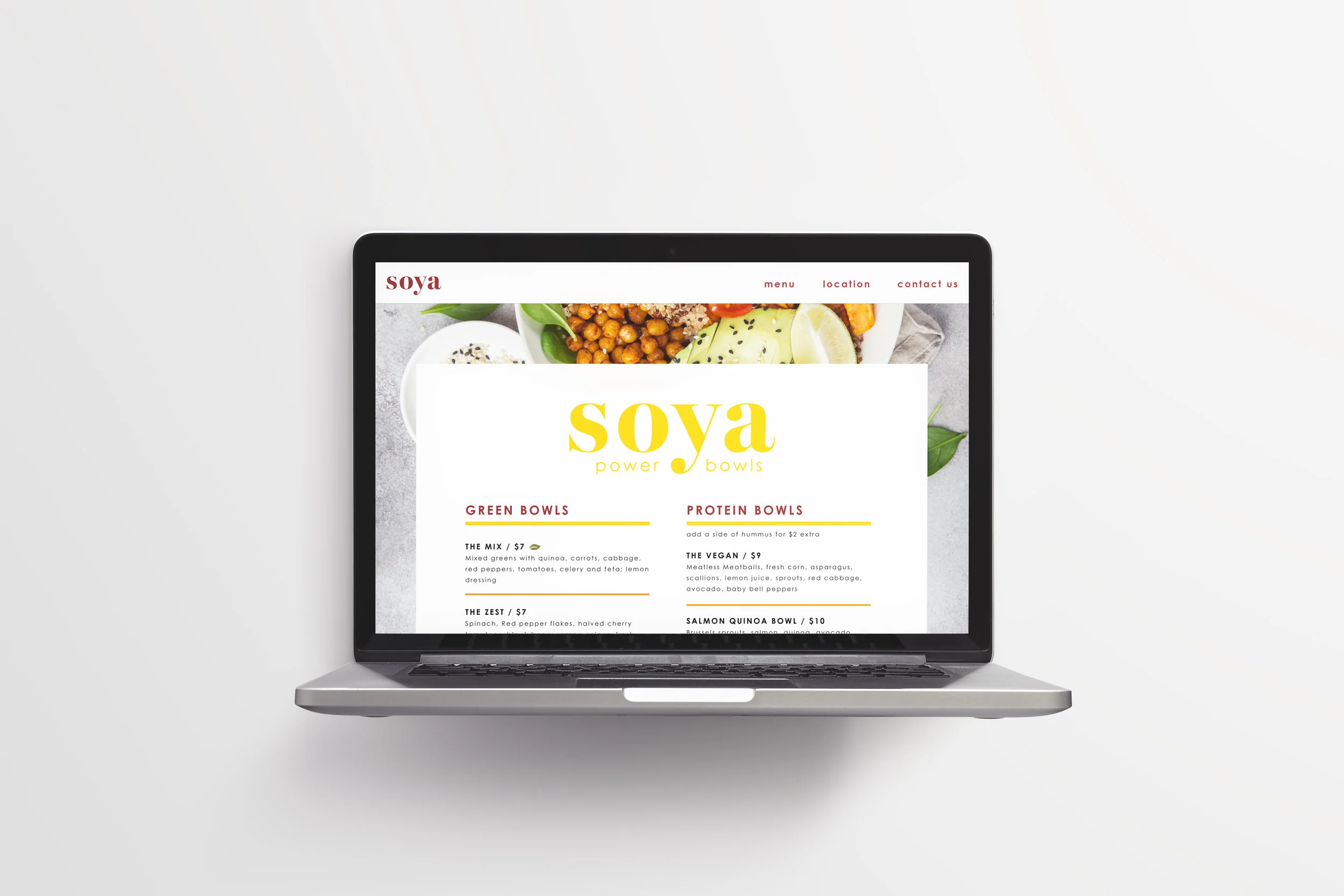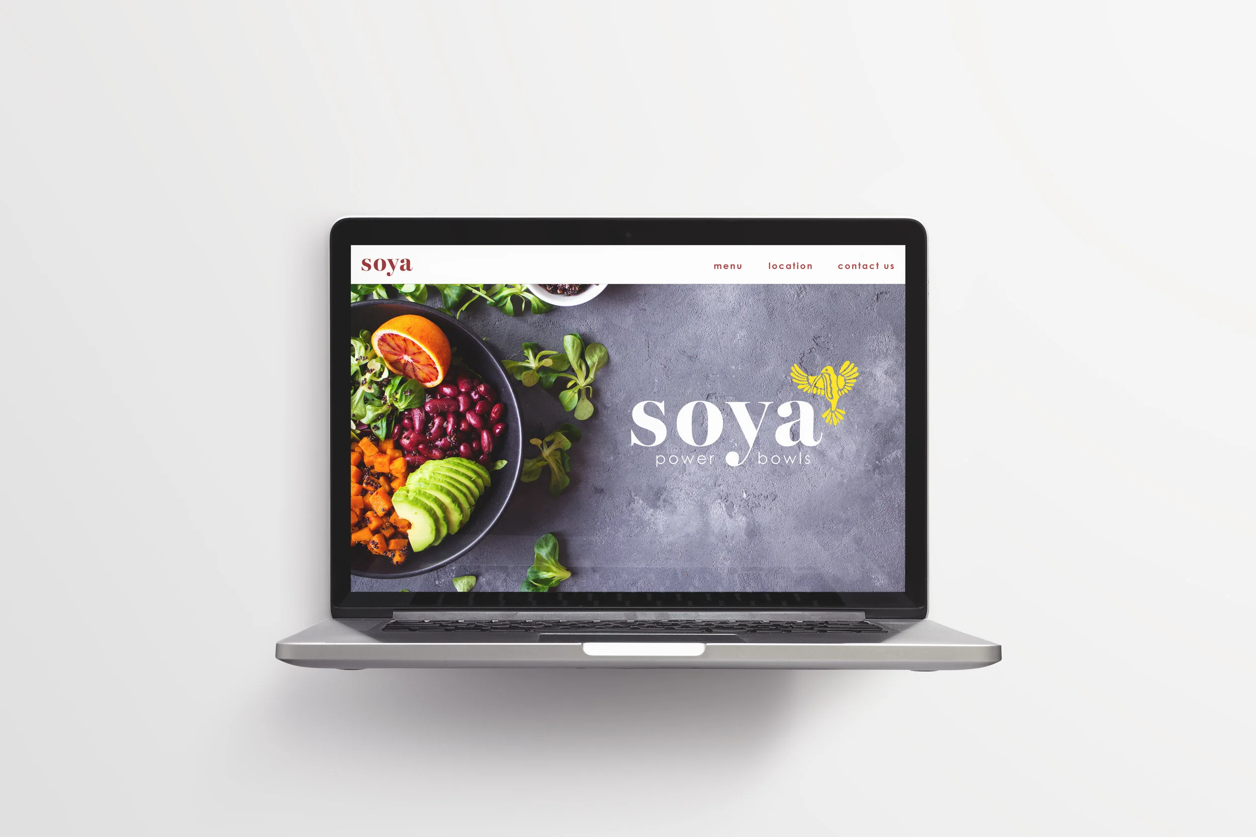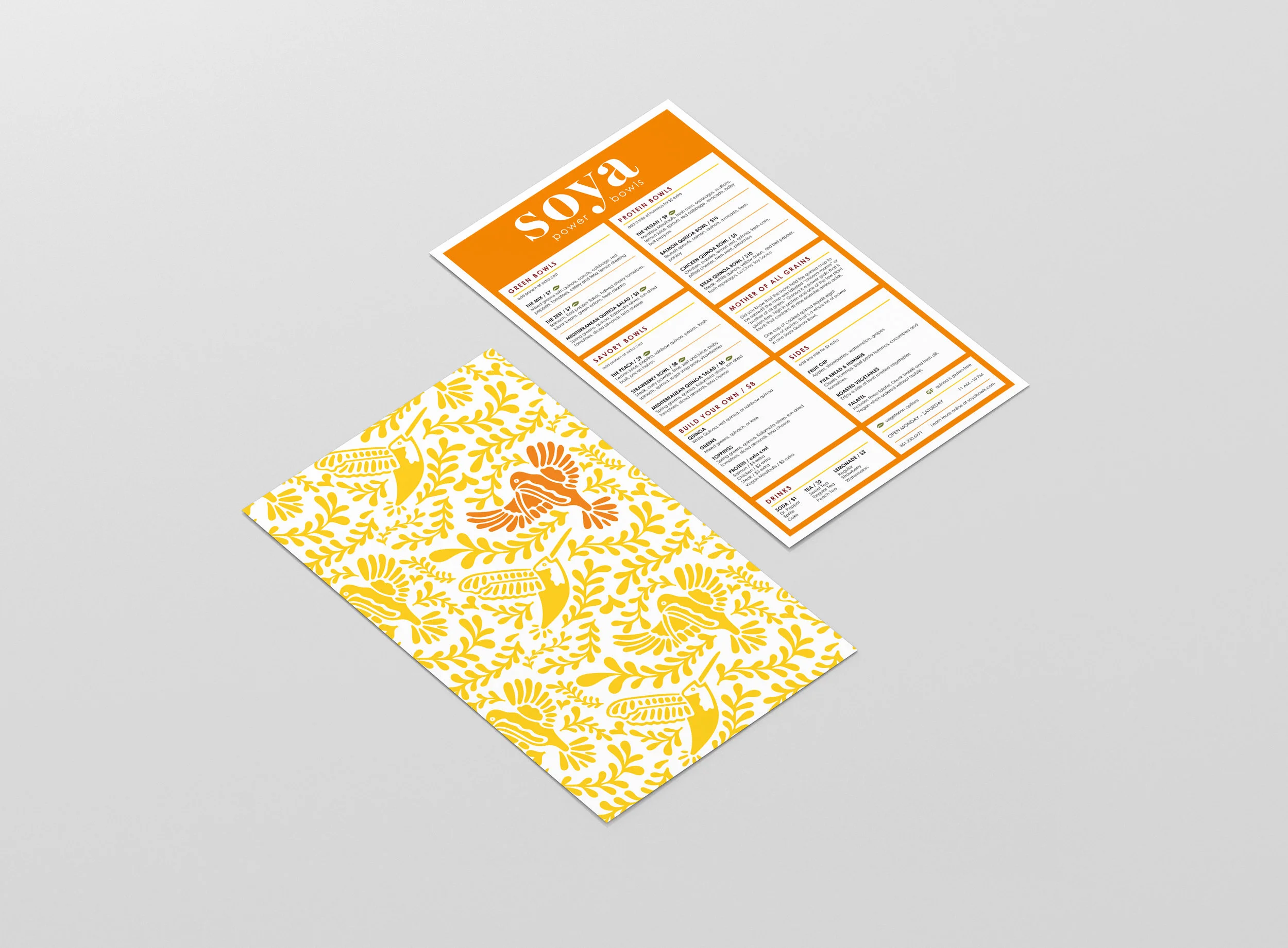 Soya provides customers with quick and easy meals that provide sustainable energy through quinoa-based bowls. One cup of cooked quinoa provides eight grams of protein. These bright branding colors portray the strength, energy, and colorful variety offered in Soya Power Bowls.