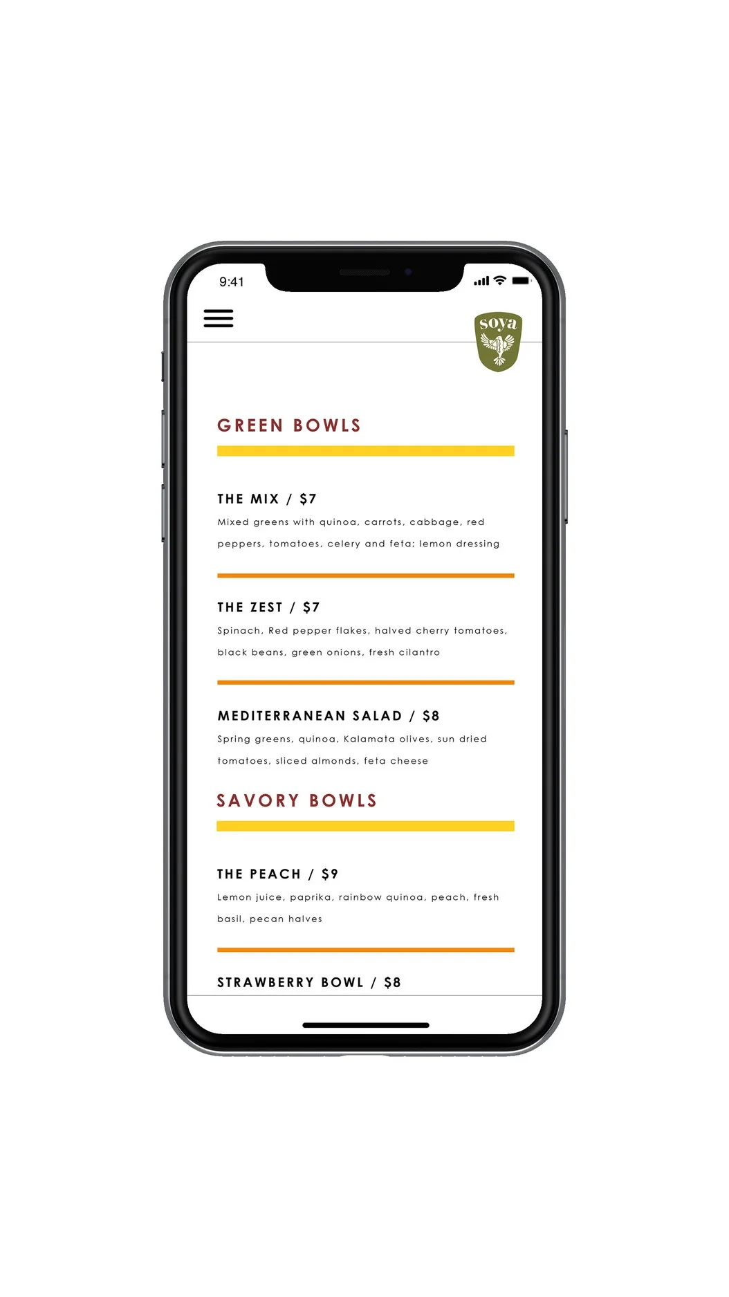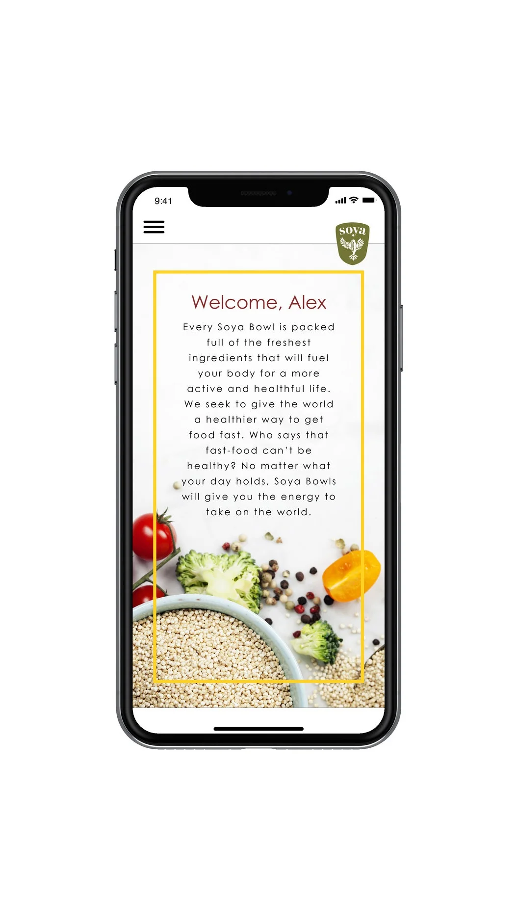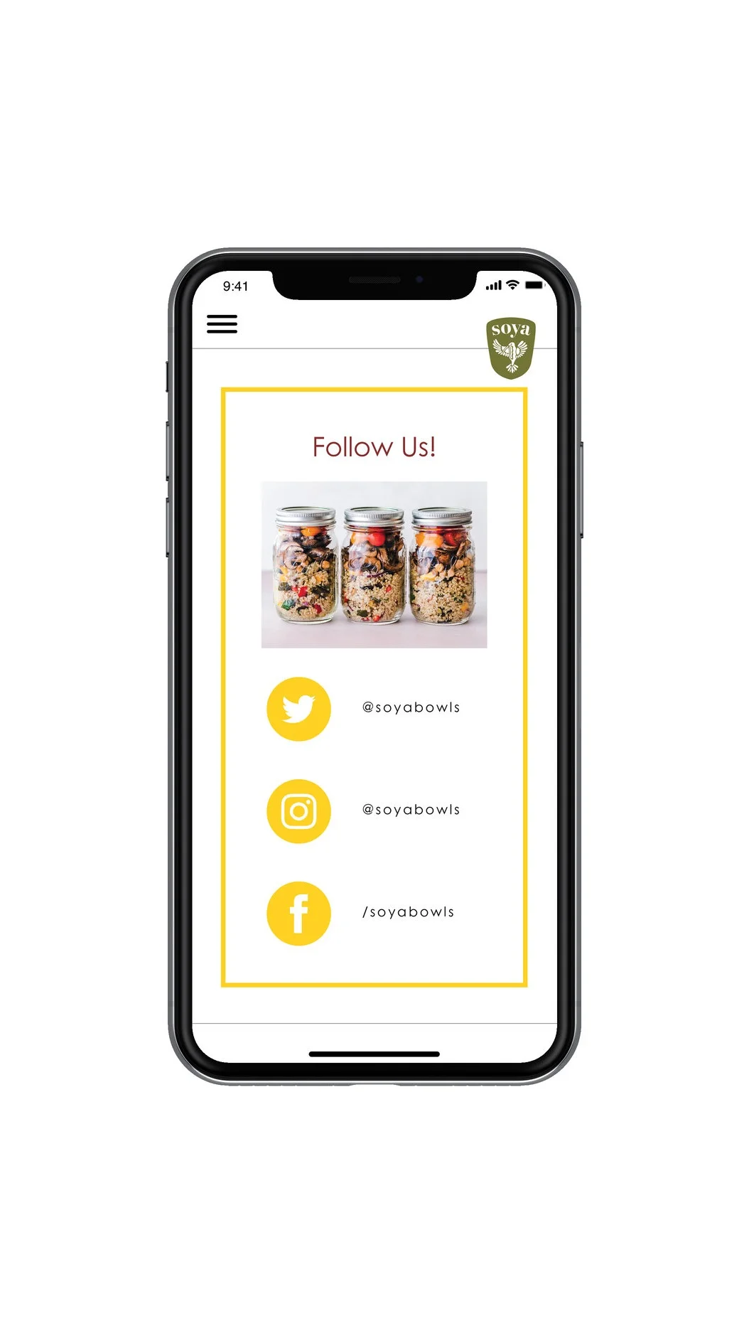 Soya provides customers with quick and easy meals that provide sustainable energy through quinoa-based bowls. One cup of cooked quinoa provides eight grams of protein. These bright branding colors portray the strength, energy, and colorful variety offered in Soya Power Bowls.